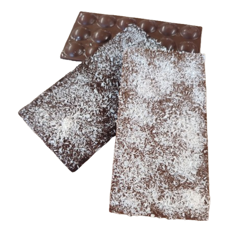 Fabriquée à partir de chocolat lait 38,2% cacao, garanti pur beurre de cacao et de noix de coco torréfiée